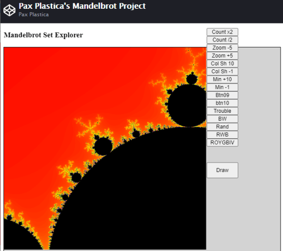 I added the Draw button rather than automatically redrawing after each change in order to speed up overall viewing. This matters on my laptop, a state-of-the-art HP 15″ Walmart special (literally). On my iPhone or iPad it is fast enough that this is not necessary. So you can, for example, shift colors by 30 by clicking “Col Sh 10” three times and then redrawing.